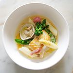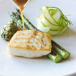 新潟県佐渡ヶ島産ヒラメと貝のショードレ 白アスパラガス